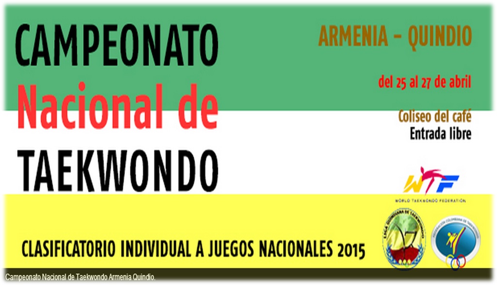 La Federación Colombiana de Taekwondo y la Liga Quindiana de Taekwondo, invita a todas las ligas afiliadas a la Federación a participar en el Campeonato Nacional Clasificatorio a Juegos Nacionales 2015, que se llevaran a cabo en los días 25, 26 y 27 de Abril del 2014.